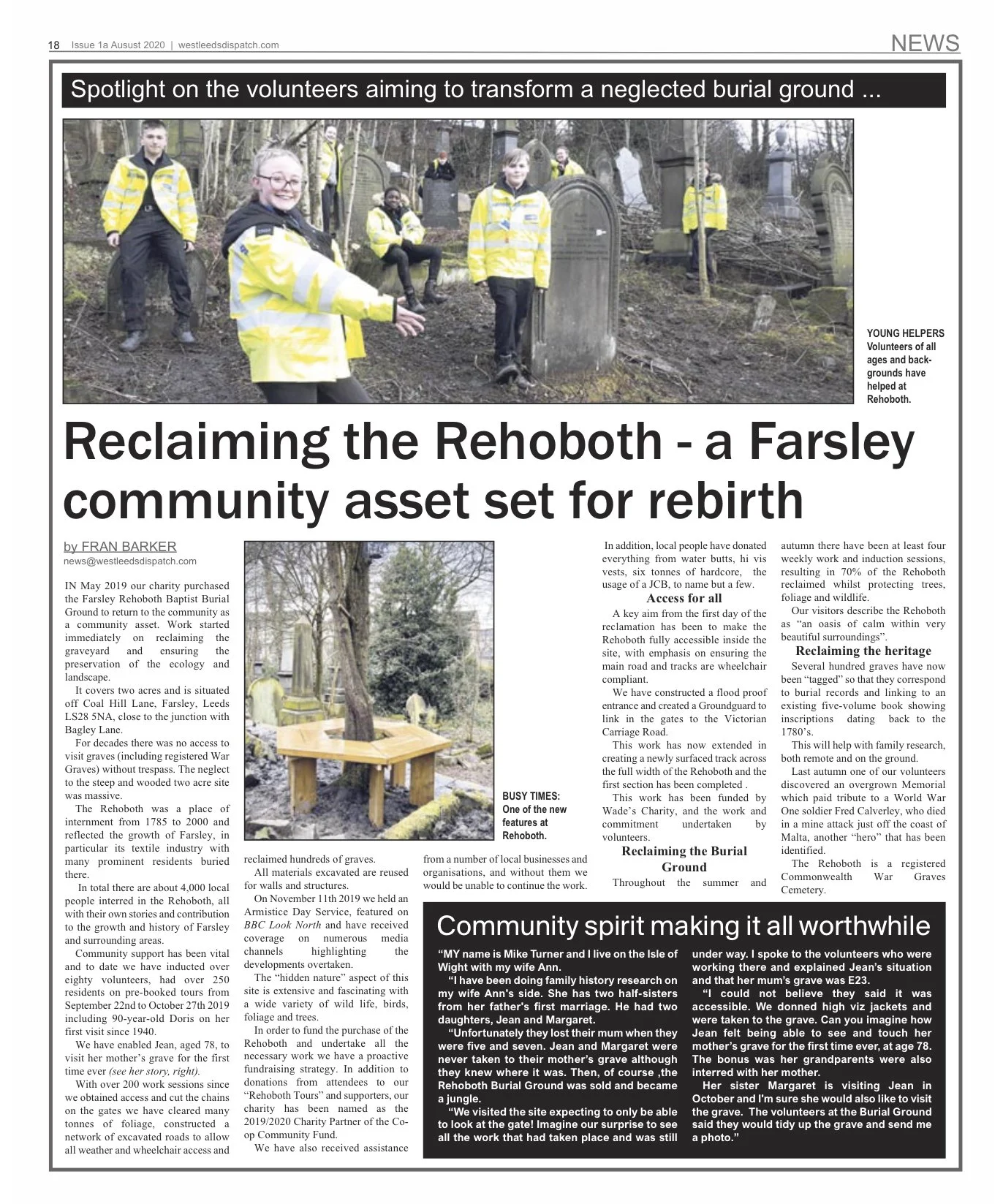 Discover our latest news articles, press cuttings & historical discoveries below… Search our News page for a specific article or scroll down to browse our stories in the order of when they were published. Press Cuttings, Volunteers, Community John Barker 07/05/2025 Press Cuttings, Volunteers, Community John Barker 07/05/2025 The King’s Award for Voluntary Service, two new articles Read More Community, Press Cuttings, Heritage, Volunteers, Events John Barker 12/04/2025 Community, Press Cuttings, Heritage, Volunteers, Events John Barker 12/04/2025 King Charles recognises our achievements Read More Heritage, Community, Press Cuttings John Barker 02/04/2025 Heritage, Community, Press Cuttings John Barker 02/04/2025 “Angela’s Letter” is in this month’s The Squeaker Read More Community, Press Cuttings John Barker 30/12/2024 Community, Press Cuttings John Barker 30/12/2024 Local Media feature our KAVS award. Read More Volunteers, Community, Press Cuttings, Reclamation John Barker 19/11/2024 Volunteers, Community, Press Cuttings, Reclamation John Barker 19/11/2024 West Leeds Dispatch feature our volunteers and KAVS Award Read More Volunteers, Heritage, Reclamation, Press Cuttings John Barker 08/03/2023 Volunteers, Heritage, Reclamation, Press Cuttings John Barker 08/03/2023 Activity Review for 2022 published in West Leeds Dispatch Read More Heritage, War Graves, Press Cuttings John Barker 10/10/2022 Heritage, War Graves, Press Cuttings John Barker 10/10/2022 The Squeaker tells the story of Edgar Lee Read More Heritage, Press Cuttings John Barker 17/11/2021 Heritage, Press Cuttings John Barker 17/11/2021 Rebuilding Great Grandad’s grave Read More Community, Press Cuttings John Barker 20/10/2021 Community, Press Cuttings John Barker 20/10/2021 Activity Review for 2020 published in West Leeds Dispatch Read More Community, Press Cuttings John Barker 20/10/2021 Community, Press Cuttings John Barker 20/10/2021 Youth volunteers featured in West Leeds Dispatch Read More Heritage, Community, Press Cuttings John Barker 14/10/2021 Heritage, Community, Press Cuttings John Barker 14/10/2021 Discovery of the lost grave of David Smith Read More Press Cuttings, Community John Barker 01/02/2021 Press Cuttings, Community John Barker 01/02/2021 Squeaker responsible for Reindeer shortage Read More Press Cuttings, Restoration John Barker 04/12/2020 Press Cuttings, Restoration John Barker 04/12/2020 Reclaim, Protect and Maintain - Progress Report 2020 Read More Press Cuttings, War Graves, Heritage John Barker 03/12/2020 Press Cuttings, War Graves, Heritage John Barker 03/12/2020 The tragic death of Arthur Illingworth, 11th Nov 1918 Read More Press Cuttings, Restoration, War Graves John Barker 02/10/2020 Press Cuttings, Restoration, War Graves John Barker 02/10/2020 John Hepworth reclaims his father’s 1940’s grave Read More Press Cuttings, Community John Barker 02/04/2020 Press Cuttings, Community John Barker 02/04/2020 VE Day event supports Rehoboth’s War Graves Read More Press Cuttings, Community, Heritage John Barker 01/02/2020 Press Cuttings, Community, Heritage John Barker 01/02/2020 The tragic tale of Lavinia Keighley, 1859-1879 Read More Press Cuttings, Restoration John Barker 22/01/2020 Press Cuttings, Restoration John Barker 22/01/2020 NFCF Winter Newsletter 2021 Read More Press Cuttings, Community, Heritage John Barker 01/12/2019 Press Cuttings, Community, Heritage John Barker 01/12/2019 Five generations of the Gorman family visit Farsley Rehoboth Read More Press Cuttings, War Graves, Heritage John Barker 11/11/2019 Press Cuttings, War Graves, Heritage John Barker 11/11/2019 BBC Look North joins us for Armistice Day Read More Older Posts