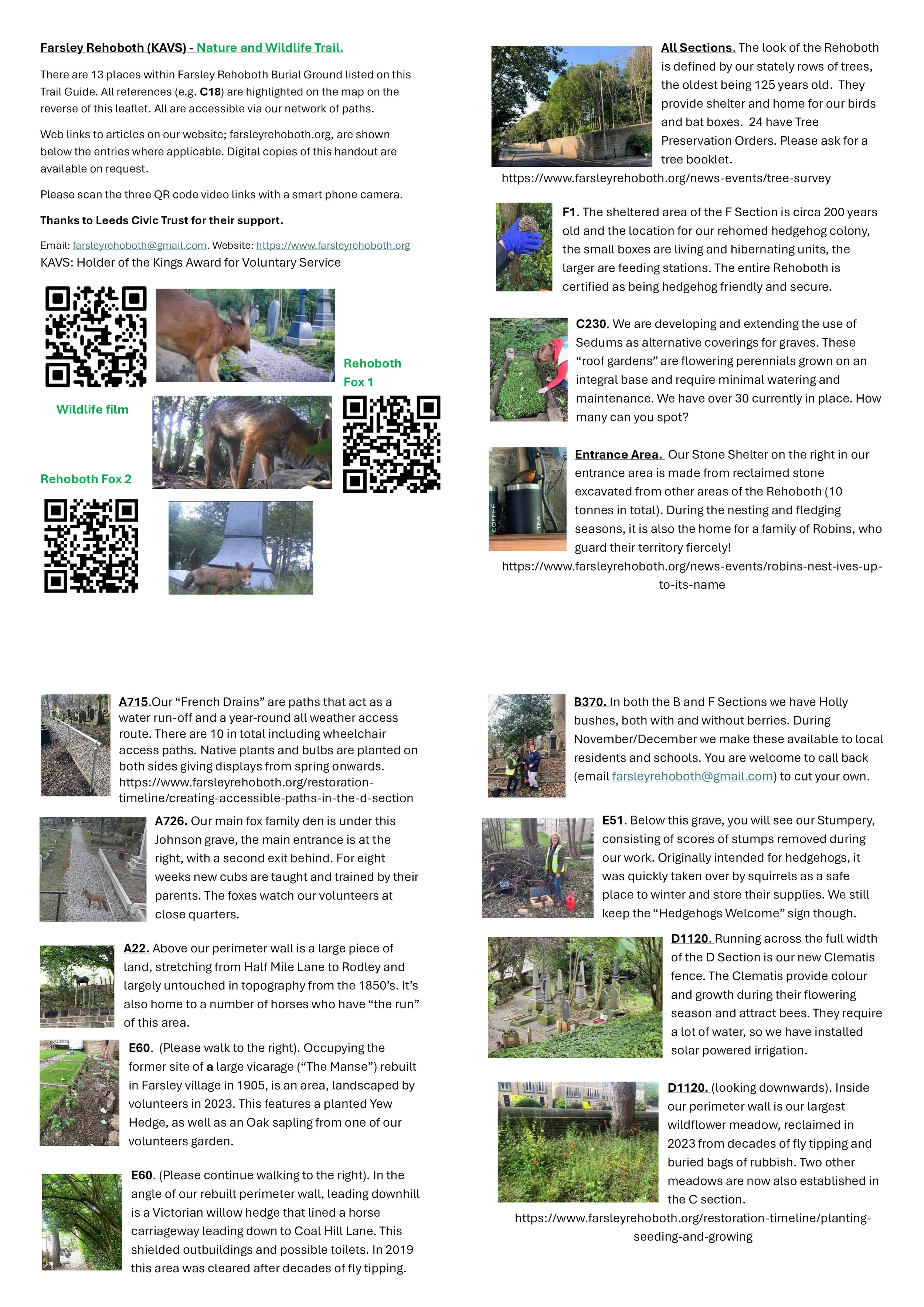 The two A3, (folded to A5) guides are titled “Architecture and History” and “Nature and Wildlife” and comprise illustrated colour trail stop offs (18 for the former and 13 for the latter), together with QR codes on the “Nature and Wildlife” giving access to specific videos. Copies are available at the Rehoboth, or you downloads Thanks to Leeds Civic Trust for funding this initiative.
