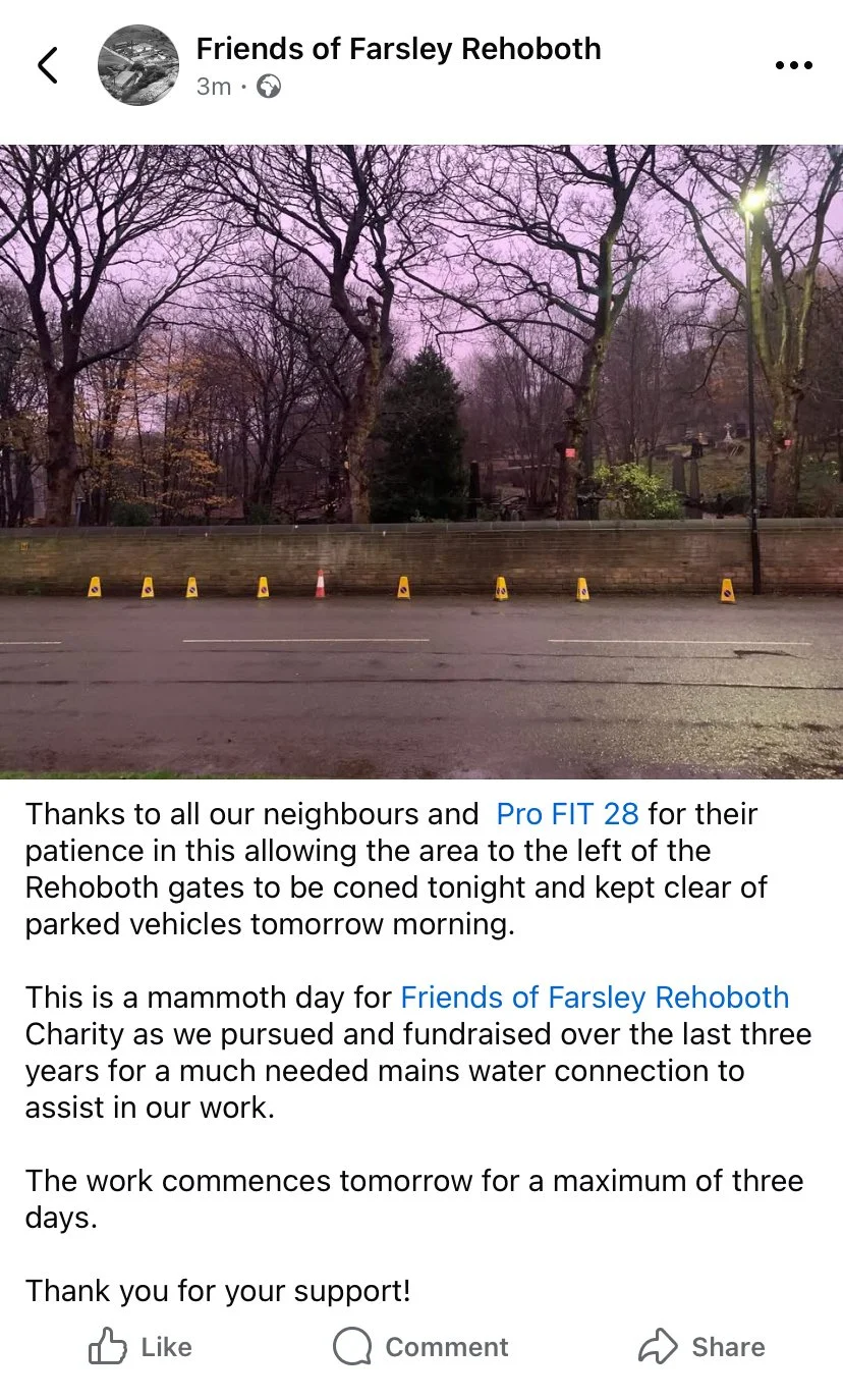 “Last night, in heavy rain, our fleet of traffic cones were placed outside the Rehoboth, to provide the working space. The request to keep clear was circulated on our three social media channels.